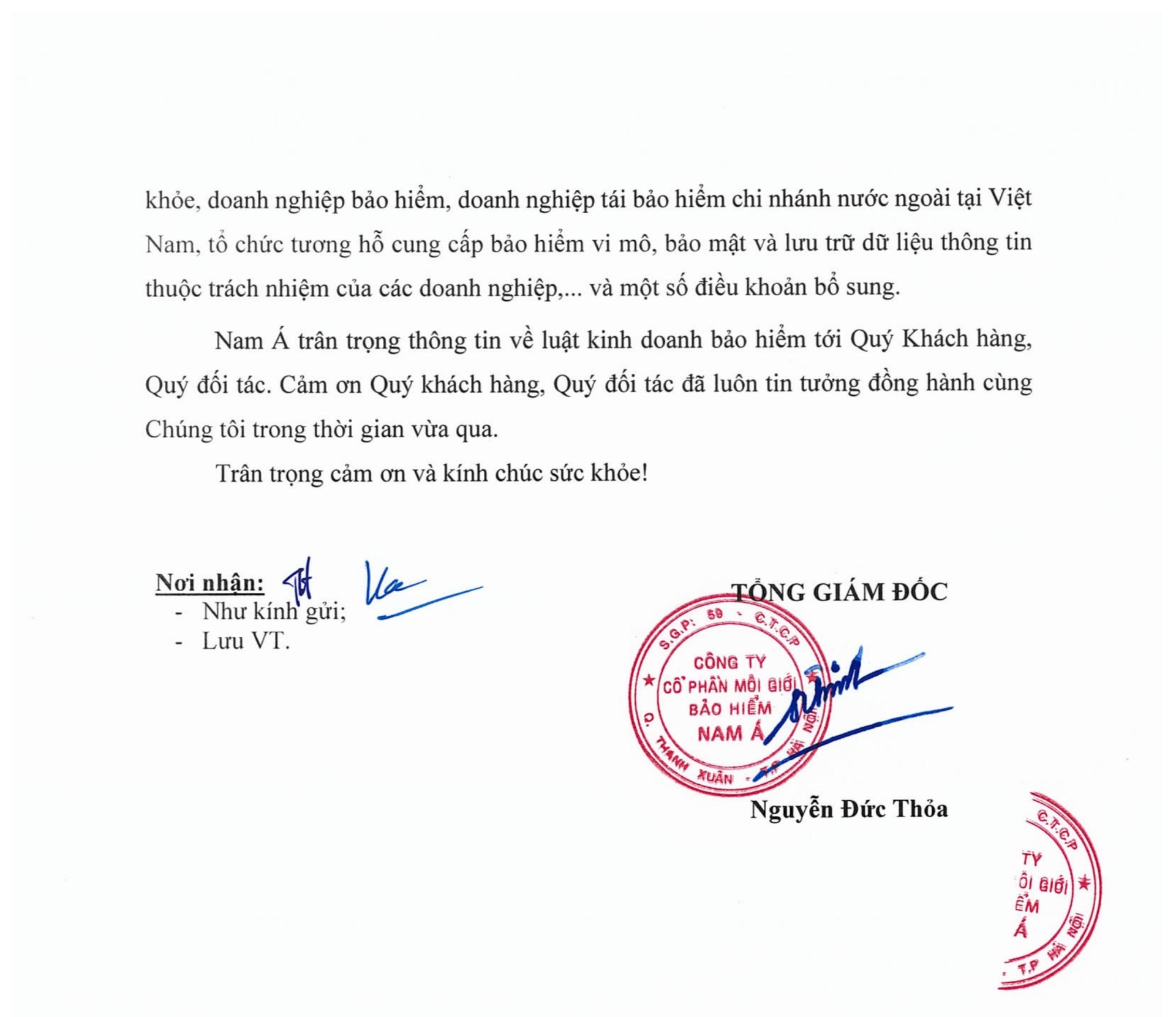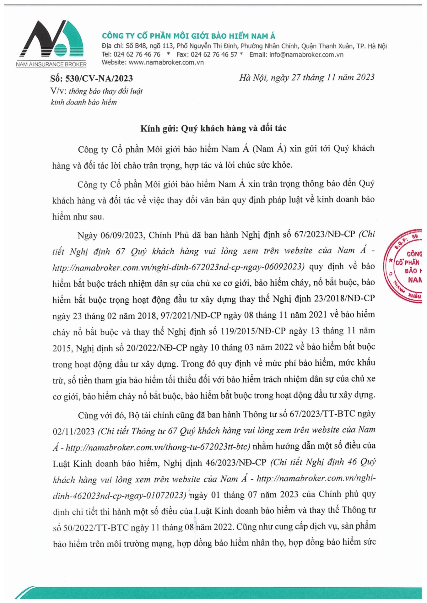 Tại công văn sô 530/CV-NA/2023 Công ty cổ phần môi giơi bảo hiểm Nam Á thông báo tới Quý khách hàng, đối tác các nội dung như sau: