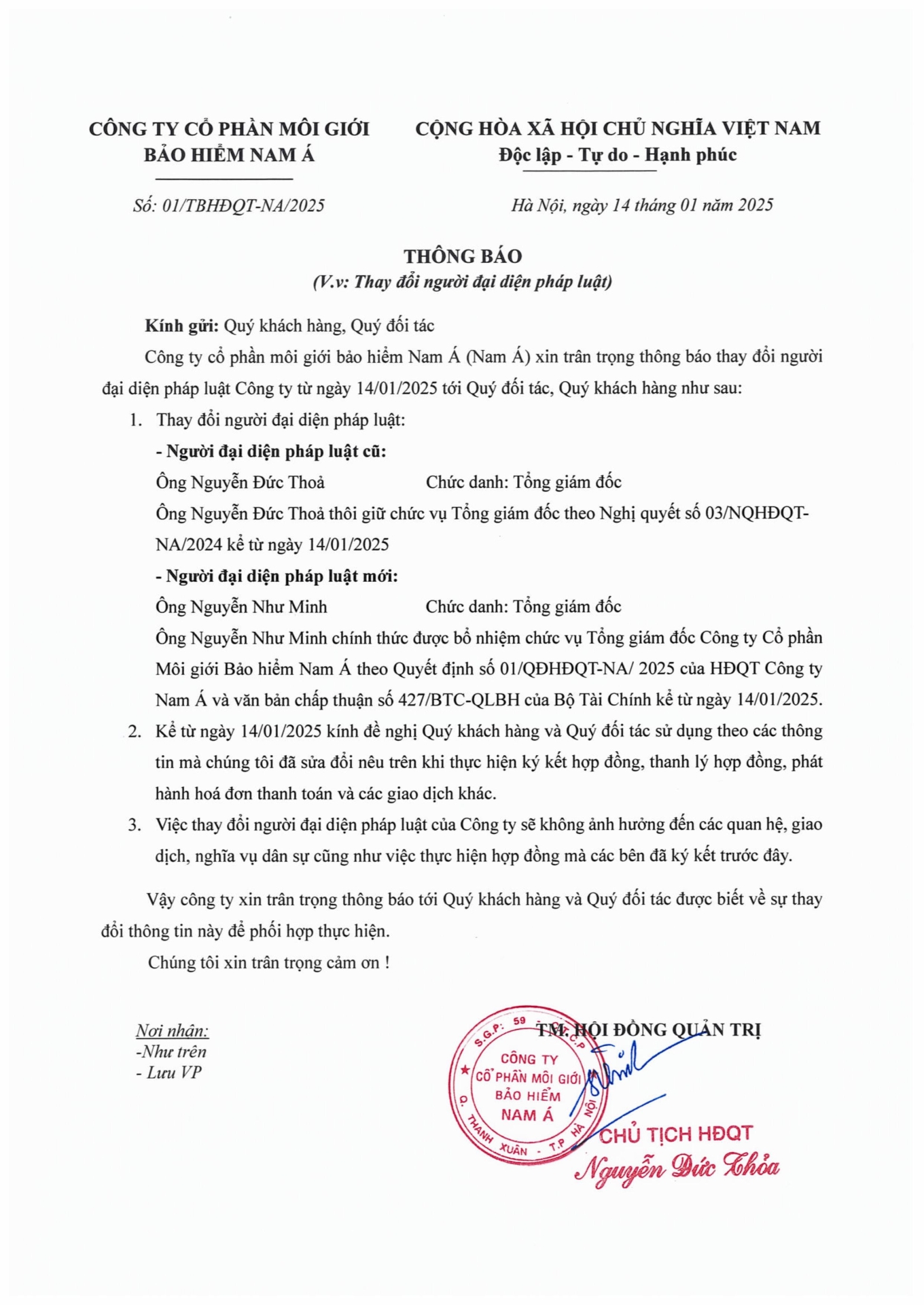 Công ty cổ phần môi giới bảo hiểm Nam Á xin trân trọng thông báo thay đổi người đại diện pháp luật của Công ty tới Quý đối tác khách hàng theo Thông báo số 01/TBHĐQT-NA/2025 ngày 14/01/2025 như sau: