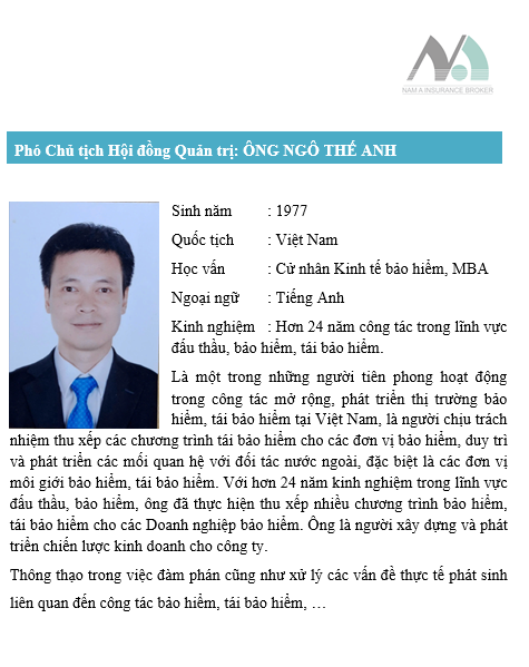 Ông Ngô Thế Anh sinh năm 1977, là cử nhân Kinh tế Bảo hiểm và sở hữu bằng MBA, với hơn 23 năm kinh nghiệm trong lĩnh vực đấu thầu, bảo hiểm và tái bảo hiểm. Trong suốt quá trình công tác, ông đã đảm nhiệm vai trò quan trọng trong việc thu xếp các chương trình bảo hiểm, tái bảo hiểm cho nhiều doanh nghiệp, đồng thời xây dựng và phát triển mối quan hệ hợp tác với các đối tác trong và ngoài nước.