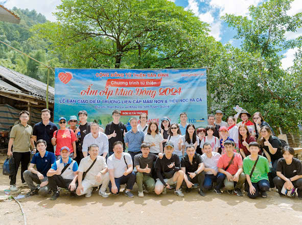 (Cộng đồng từ thiện Sân Đình chụp ảnh lưu niệm tại lễ bàn giao điểm trường Ha Cá)