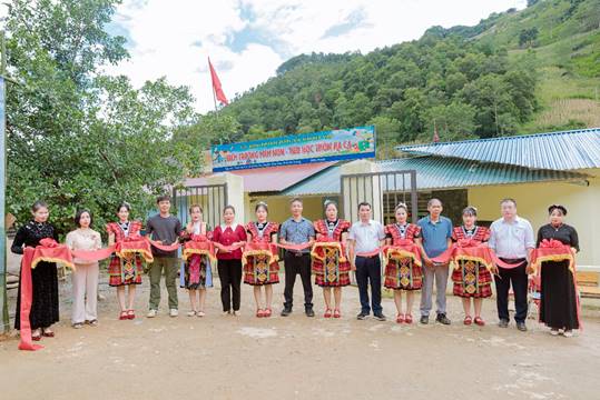 (Đại diện Cty CP MGBH Nam Á, Cộng đồng từ thiện Sân Đình cùng các thầy, cô Hiệu trưởng trường Mầm non, tiểu học Ha Cá cắt bang khánh thành điểm trường)