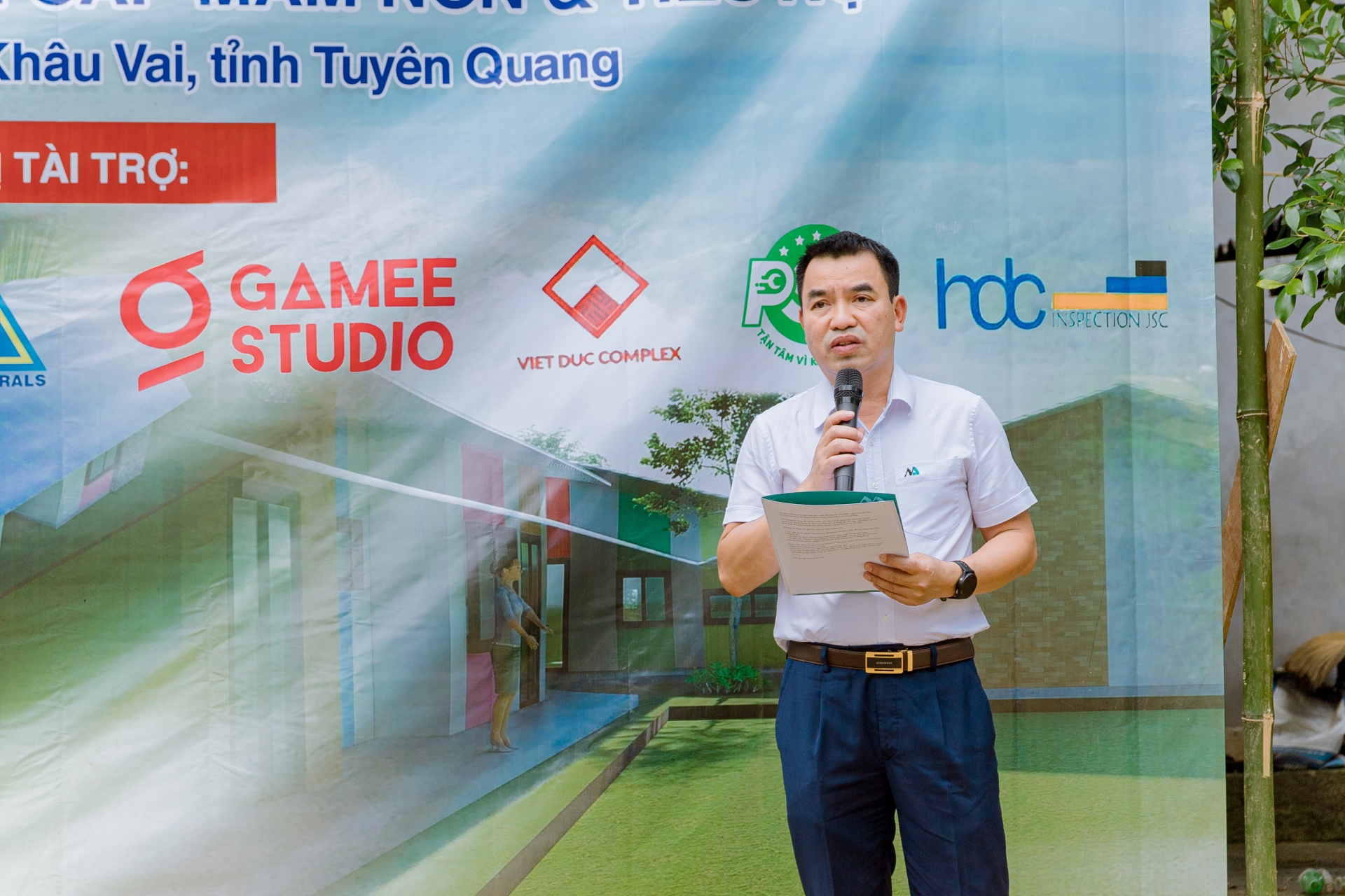 Ông Nguyễn Đức Thoả Chủ tịch HĐQT Nam Á phát biểu tại lễ bàn giao điểm trường Ha Cá - Ảnh Phải)